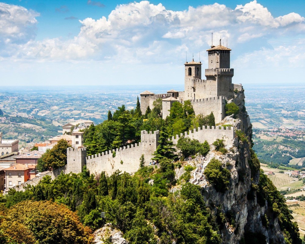 Lo Stato di San Marino è il terzo Paese più piccolo d'Europa e la più antica repubblica del mondo. San Marino situato sui fianchi del monte Titano ha una sua Zecca, francobolli propri, una squadra di calcio e un esercito. Da non perdere sono le tre stupende fortificazioni collegate con camminamenti alla cittadella sottostante racchiusa da una triplice cerchia di mura. In qualunque parte del territorio, in particolare dalla cima del suo monte, si gode un panorama unico ed indimenticabile, tra le campagne dell'Emilia Romagna e le colline delle Marche e del Montefeltro, fino al mare Adriatico.